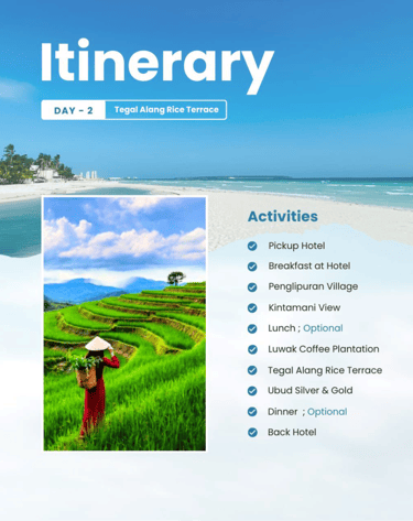Start your day with a relaxing breakfast at the hotel before exploring the cultural heart of Bali. Visit the beautiful Penglipuran Village, known for its traditional houses and peaceful atmosphere, then continue to Kintamani to enjoy breathtaking views of Mount Batur and its surrounding lake. After an optional lunch, experience the unique taste of Bali at a Luwak Coffee Plantation, followed by a stop at the famous Tegalalang Rice Terrace with its stunning green landscapes. Discover exquisite craftsmanship at an Ubud Silver & Gold Jewelry workshop, enjoy an optional dinner, and end the day comfortably as you return to your hotel.